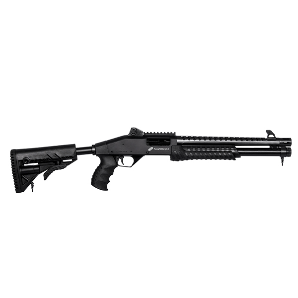 A Pump Military CBC 3.0 proporciona alto poder de fogo, rapidez de tiro e facilidade de acionamento, graças ao sistema por ação deslizante (pump).Possui câmara de 3”, capacidade de até 6 disparos e coronha Retrátil de 6 posições com sistema de amortecimento de recuo, que reduz em até 50% o impacto no disparo.